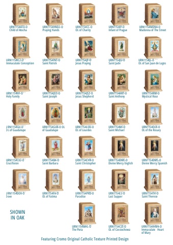 URN1154HF-OHoly FamilyURN1154CX2-OCrucifixionURN1154DOV-ODoveURN1154GU-OOL of GuadalupeURN1154ATO-OChild of AtochaURN1154IC2-OImmaculate ConceptionURN1154FA-OOL of FatimaURN1154BA-OSaint BarbaraURN1154PAT-OSaint PatrickURN1154JO3-OSaint JosephURN1154GU8-O OLof GuadalupeURN1154HND2-OPraying HandsURN1154MHL-OThe PietaURN1154JP-OJesus PrayingURN1154CC-OOL of CharityURN1154PRD-OParadiseURN1154LOU-OOL of LourdesURN1154JS2-OJesus ShepherdURN1154CHR-OSaint ChristopherURN1154JU-OSaint JudeURN1154LS-OLast SupperURN1154MI-OSaint MichaelURN1154IP-OInfant of PragueURN1154ANT-OSaint AnthonyURN1154CZE-OOL of CzestochowaURN1154DME-ODivine Mercy EnglishURN1154TH-OSaint ThereseURN1154RM-OMystical RoseURN1154OLR-OOL of the RosaryURN1154IHM4-OImmaculate Heartof MaryURN1154DMS-ODivine Mercy SpanishURN1154MDN4-OMadonna of The StreetURN1154JL-OOL of San Juan de LagosFeaturing Cromo Original Catholic Texture Printed DesignSHOWNIN OAK