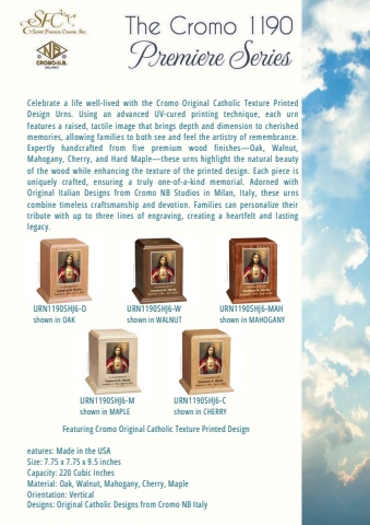 URN1190SHJ6-Oshown in OAKURN1190SHJ6-Mshown in MAPLEURN1190SHJ6-Wshown in WALNUTURN1190SHJ6-Cshown in CHERRYFeaturing Cromo Original Catholic Texture Printed Designeatures: Made in the USASize: 7.75 x 7.75 x 9.5 inchesCapacity: 220 Cubic InchesMaterial: Oak, Walnut, Mahogany, Cherry, MapleOrientation: VerticalDesigns: Original Catholic Designs from Cromo NB ItalyURN1190SHJ6-MAHshown in MAHOGANYCelebrate a life well-lived with the Cromo Original Catholic Texture PrintedDesign Urns. Using an advanced UV-cured printing technique, each urnfeatures a raised, tactile image that brings depth and dimension to cherishedmemories, allowing families to both see and feel the artistry of remembrance.Expertly handcrafted from five premium wood finishes%u2014Oak, Walnut,Mahogany, Cherry, and Hard Maple%u2014these urns highlight the natural beautyof the wood while enhancing the texture of the printed design. Each piece isuniquely crafted, ensuring a truly one-of-a-kind memorial. Adorned withOriginal Italian Designs from Cromo NB Studios in Milan, Italy, these urnscombine timeless craftsmanship and devotion. Families can personalize theirtribute with up to three lines of engraving, creating a heartfelt and lastinglegacy.