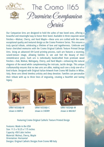 URN1165SHJ6-Mshown in MAPLEURN1165SHJ6-Cshown in CHERRYFeaturing Cromo Original Catholic Texture Printed DesignFeatures: Made in the USASize: 11.5 x 10.25 x 7.75 inchesCapacity: 450 Cubic InchesMaterial: Walnut, Cherry, MapleOrientation: HorizontalDesigns: Original Catholic Designs from Cromo NB ItalyURN1165SHJ6-Wshown in WALNUTOur Companion Urns are designed to hold the ashes of two loved ones, offering abeautiful and meaningful way to honor their bond. Available in three exquisite woodfinishes%u2014Walnut, Cherry, and Hard Maple%u2014these urns are crafted with the sameexceptional quality and textured design as the Cromo Premiere Series. This ensures atruly special tribute, celebrating a lifetime of love and togetherness. Celebrate andhonor cherished memories with the Cromo Original Catholic Texture Printed DesignUrns. Using an advanced UV-Cured printing process, each urn features a stunning,raised-texture image, allowing families to see and feel the beauty of theirremembrance piece. Each urn is individually handcrafted from premium woodfinishes%u2014Oak, Walnut, Mahogany, Cherry, and Hard Maple%u2014enhancing the naturalelegance of the wood while complementing the intricate, tactile design. This uniquecraftsmanship ensures that no two urns are alike, making each one a truly one-of-akind tribute. Designed with Original Italian Artwork from Cromo NB Studios in Milan,Italy, these urns blend timeless artistry and deep devotion. Families can personalizetheir tribute with up to three lines of engraving, creating a heartfelt and lastinglegacy.