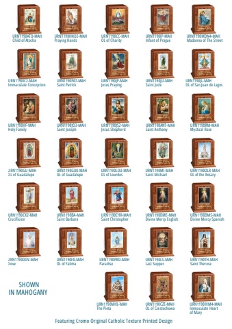 URN1190HF-MAHHoly FamilyURN1190GU-MAHOL of GuadalupeURN1190CX2-MAHCrucifixionURN1190DOV-MAHDoveURN1190IC2-MAHImmaculate ConceptionURN1190ATO-MAHChild of AtochaURN1190FA-MAHOL of FatimaURN1190BA-MAHSaint BarbaraURN1190HND2-MAHPraying HandsURN1190PAT-MAHSaint PatrickURN1190JO3-MAHSaint JosephURN1190GU8-MAHOL of GuadalupeURN1190MHL-MAHThe PietaURN1190JP-MAHJesus PrayingURN1190PRD-MAHParadiseURN1190JS2-MAHJesus ShepherdURN1190CC-MAHOL of CharityURN1190CHR-MAHSaint ChristopherURN1190LOU-MAHOL of LourdesURN1190JU-MAHSaint JudeURN1190LS-MAHLast SupperURN1190MI-MAHSaint MichaelURN1190IP-MAHInfant of PragueURN1190ANT-MAHSaint AnthonyURN1190DME-MAHDivine Mercy EnglishURN1190CZE-MAHOL of CzestochowaURN1190TH-MAHSaint ThereseURN1190RM-MAHMystical RoseURN1190OLR-MAHOL of the RosaryURN1190IHM4-MAHImmaculate Heartof MaryURN1190DMS-MAHDivine Mercy SpanishURN1190MDN4-MAHMadonna of The StreetURN1190JL-MAHOL of San Juan de LagosFeaturing Cromo Original Catholic Texture Printed DesignSHOWNIN MAHOGANY
