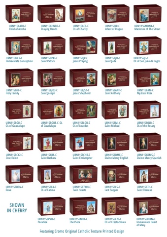 URN1156HF-CHoly FamilyURN1156CX2-CCrucifixionURN1156DOV-CDoveURN1156GU-COL of GuadalupeURN1156ATO-CChild of AtochaURN1156IC2-CImmaculate ConceptionURN1156PRD-CParadiseURN1156FA-COL of FatimaURN1156BA-CSaint BarbaraURN1156PAT-CSaint PatrickURN1156JO3-CSaint JosephURN1156GU8-C OLof GuadalupeURN1156HND2-CPraying HandsURN1156MHL-CThe PietaURN1156JP-CJesus PrayingURN1156CC-COL of CharityURN1156LOU-COL of LourdesURN1156TWH-CTwin HeartsURN1156JS2-CJesus ShepherdURN1156CHR-CSaint ChristopherURN1156JU-CSaint JudeURN1156LS-CLast SupperURN1156MI-CSaint MichaelURN1156IP-CInfant of PragueURN1156ANT-CSaint AnthonyURN1156CZE-COL of CzestochowaURN1156DME-CDivine Mercy EnglishURN1156TH-CSaint ThereseURN1156RM-CMystical RoseURN1156OLR-COL of the RosaryURN1156IHM4-CImmaculate Heartof MaryURN1156DMS-CDivine Mercy SpanishURN1156MDN4-CMadonna of The StreetURN1156JL-COL of San Juan de LagosFeaturing Cromo Original Catholic Texture Printed DesignSHOWNIN CHERRY