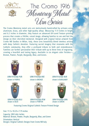 URN1916SHJ6-PURshown in PURPLEURN1916SHJ6-BRZshown in BRONZEURN1916SHJ6-BURshown in BURGUNDYURN1916SHJ6-BLUshown in BLUEURN1916SHJ6-PEWshown in PEWTERURN1916SHJ6-GRNshown in GREENFeaturing Cromo Original Catholic Texture Printed DesignSize: 11.5 x 10.25 x 7.75 inchesCapacity: 200 Cubic InchesMaterial: Bronze, Pewter, Purple, Burgundy, Blue, and GreenOrientation: VerticalDesigns: Original Catholic Designs from Cromo NB ItalyThe Cromo Monterey metal urns are meticulously handcrafted by artisans usingaluminum, brass, and other high-quality alloys. Measuring 11.9 inches in heightand 6.2 inches in diameter, they feature an advanced UV-cured Texture printingprocess that creates a lifelike, raised image, allowing families to see and feel thedesign on their cherished memorial. Designed with original Italian artwork fromCromo NB Studios in Milan, Italy, these urns beautifully blend timeless artistrywith deep Catholic devotion. Featuring sacred imagery that resonates with theCatholic community, they offer a profound tribute to faith and remembrance.Families can further personalize their tribute with up to three lines of engraving,creating a heartfelt and lasting legacy. Available in six elegant color finishes%u2014Bronze, Pewter, Purple, Burgundy, Blue, and Green.
